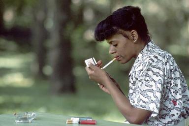 | Keywords: Woman smoking (3).jpg An African American woman sitting at a picnic table in a park lighting a cigarette Topics/Categories Locations Nature/Outdoors Risk Factors and Causes Type Color Photo Source National Cancer Institute Bill Branson photographer 2246 The Web site of the National Cancer Institute http //www cancer gov 1986-05 Reuse Restrictions None - This image is in the public domain and can be freely reused Please credit the source and/or author listed above Bill Branson photographer PD-USGov-HHS-NIH Media from National Cancer Institute Visuals Online Images uploaded by Fæ |