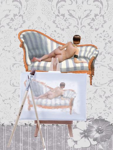 Keywords: woman sofa naked sit emotion lying statue melancholic paint image artist render rest drawing paint easel flowers artistically artfully brush canvas structure creativity pattern texture background