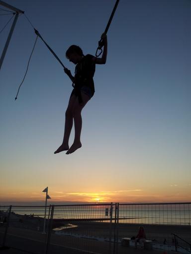 Keywords: woman sport belt trampoline jumping on a trampoline action elastic norderney beach sea sun sunset abendstimmung