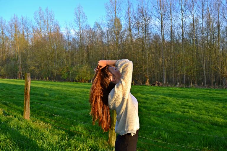 Keywords: woman young woman her long hair hairdo red red hair ros nice people beauty outdoor nature blue sky trees meadow green spring