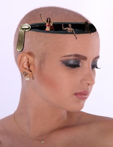 Keywords: woman zipper bald female fashion attractive young model fantasy hairstyle posing fashion model face man dog sexy