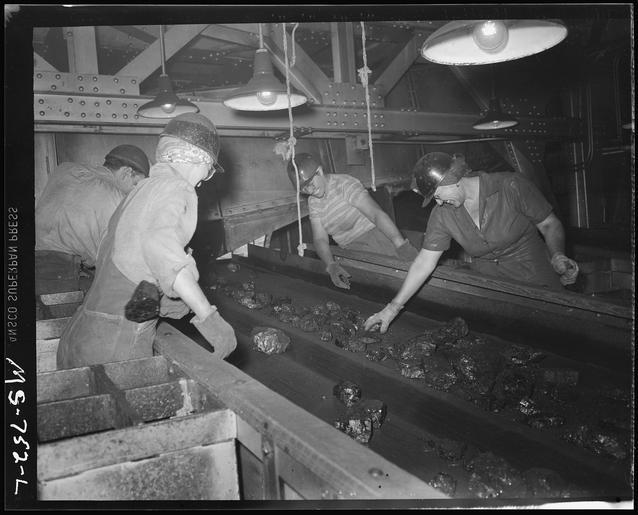 | Keywords: Women pick foreign matter out of coal as it is carried on conveyor thru tipple. Union Pacific Coal Company, Stansbury... - NARA - 540581.tif Scope and content General notes 540581 Local identifier 245-MS-752L Department of the Interior Solid Fuels Administration For War 04/19/1943 - 06/30/1947 NARA-Author Lee Russell 1903-1986 Photographer 2489414 <br /> Still Picture Records Section Special Media Archives Services Division NWCS-S National Archives at College Park 8601 Adelphi Road College Park MD 20740-6001 1946-07-10 Record group Record Group 245 Records of the Solid Fuels Administration for War 1937 - 1948 Record group ARC 572 Photographs of the Medical Survey of the Bituminous Coal Industry compiled 1946 - 1947 Series ARC 540230 File unit File unit ARC Variant control numbers NAIL Control Number NWDNS-245-MS-752L yes Other versions <gallery> File Women_pick_foreign_matter_out_of_coal_as_it_is_carried_on_conveyor_thru_tipple _Union_Pacific_Coal_Company _Stansbury _-_NARA_-_540581 tif tif File Women_pick_foreign_matter_out_of_coal_as_it_is_carried_on_conveyor_thru_tipple _Union_Pacific_Coal_Company _Stansbury _-_NARA_-_540581 jpg jpg </gallery> NARA-cooperation PD-USGov Women at work in the United States Coal miners Stansbury Mine Coal mining in the United States July 1946 1946 in the United States Wyoming in the 1940s Russell Lee NARA TIF images with categorized JPGs |