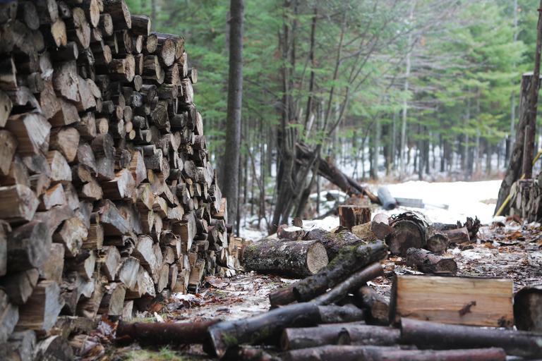 Keywords: wood logs stack pile forest timber lumber nature wooden trees cut branches bark snow winter