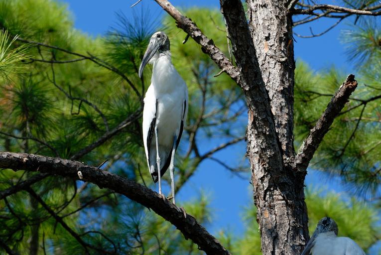 Keywords: wood stork stork bird wildlife avian marsh land mycteria nature white florida wild animal flight wings beak feathers portrait large plumage america everglades migratory sky tropical tree standing perched