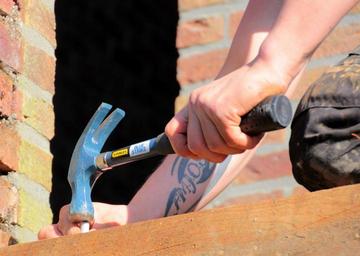 Keywords: wooden board larch dowel plastic hammer dowel strike fix carpenter work hands outdoor