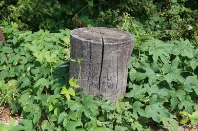 Keywords: wooden stump column green foliage outdoors