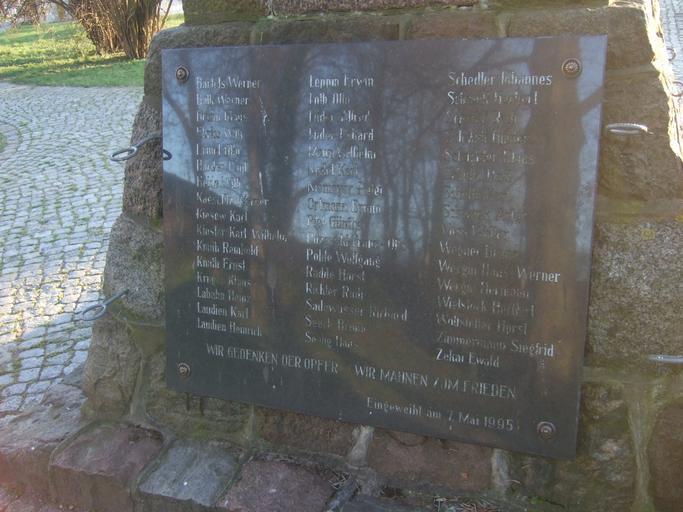 | Keywords: Word War I + II memorial Koserow 003.jpg en World War I + II memorial in Koserow Mecklenburg-Vorpommern Germany de Denkmal für Gefallene des Ersten und Zweiten Weltkrieges in Koserow Mecklenburg-Vorpommern Deutschland Inschrift <poem>Bartels Werner Balk Werner Brahn Klaus Ehrke Willi Ermel Otto Harder Paul Heide Willi Kaeschitz Werner Kiesow Karl Kloster Karl Wilhelm Knuth Reinhold Knuth Ernst Krüger Klaus Labahn Heinz Laudien Karl --- Leppin Erwin Loth Otto Lüder Alfred Lüder Erhard Mann Wilhelm Nedel Karl Niemeyer Peter Ortmann Bruno Piel Günther Pozorski Franz-Otto Pohle Wolfgang Radde Horst Richter Rudi Sadewasser Richard Seech Bruno Seelig Hans --- Schedler Johannes Schmidt Herbert Schmidt Rudi Schmidt Günter Schneider Klaus Schultz Rudi Schultz Karl Schwank Artur Voss Walter Wegner Bruno Wergin Hans-Werner Wergin Hermann Wolfsheller Horst Zimmermann Siegfried Zekai Ewald --- WIR GEDENKEN DER OPFER WIR MAHNEN ZUM FRIEDEN Eingeweiht am 7 Mai 1995</poem> own Sebastian Wallroth 2009-04-10 54 3 1 49 N 13 59 56 91 E region DE_heading WSW War memorials in Landkreis Vorpommern-Greifswald Cultural heritage monuments in Koserow World War I + II memorial Koserow 003.jpg en World War I + II memorial in Koserow Mecklenburg-Vorpommern Germany de Denkmal für Gefallene des Ersten und Zweiten Weltkrieges in Koserow Mecklenburg-Vorpommern Deutschland Inschrift <poem>Bartels Werner Balk Werner Brahn Klaus Ehrke Willi Ermel Otto Harder Paul Heide Willi Kaeschitz Werner Kiesow Karl Kloster Karl Wilhelm Knuth Reinhold Knuth Ernst Krüger Klaus Labahn Heinz Laudien Karl --- Leppin Erwin Loth Otto Lüder Alfred Lüder Erhard Mann Wilhelm Nedel Karl Niemeyer Peter Ortmann Bruno Piel Günther Pozorski Franz-Otto Pohle Wolfgang Radde Horst Richter Rudi Sadewasser Richard Seech Bruno Seelig Hans --- Schedler Johannes Schmidt Herbert Schmidt Rudi Schmidt Günter Schneider Klaus Schultz Rudi Schultz Karl Schwank Artur Voss Walter Wegner Bruno Wergin Hans-Werner Wergin Hermann Wolfsheller Horst Zimmermann Siegfried Zekai Ewald --- WIR GEDENKEN DER OPFER WIR MAHNEN ZUM FRIEDEN Eingeweiht am 7 Mai 1995</poem> own Sebastian Wallroth 2009-04-10 54 3 1 49 N 13 59 56 91 E region DE_heading WSW War memorials in Landkreis Vorpommern-Greifswald Cultural heritage monuments in Koserow |