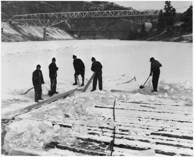 | Keywords: Workmen cutting ice around a raft of wood piling, showing the thickness of ice which formed during February - NARA - 294247.jpg Scope and content Photograph from Volume Two of a series of photo albums documenting the construction of the Grand Coulee Dam and related work on the Columbia Basin Project General notes 294247 Local identifier Department of the Interior Bureau of Reclamation Engineering and Research Center 05/18/1981 - 03/04/1988 NARA's Rocky Mountain Region Denver NRGA Building 48 Denver Federal Center West 6th Avenue and Kipling Street Denver CO 80225-0307 1936-02-19 Record group Record Group 115 Records of the Bureau of Reclamation 1889 - 2008 Record group ARC 444 Photograph albums compiled 1903 - 1972 Series ARC 293611 File unit File unit ARC Variant control numbers NAIL Control Number NRG-115-CONSTPHO85006-COLBASIN2977 Other versions <gallery> File Workmen cutting ice around a raft of wood piling showing the thickness of ice which formed during February - NARA - 294247 tif tif </gallery> NARA-cooperation PD-USGov Ice cutting People on ice February 1936 Crosscut saws Bridges in the United States 1936 in the United States |