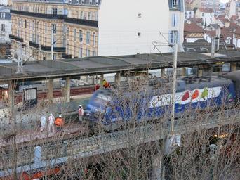 | Keywords: Works in Colombes train station.jpg en Refection works in the railway train station in Colombes Hauts-de-Seine France Happily workers work on a track différent of this used by the trains fr Travaux de réfection de la gare de Colombes Hauts-de-Seine Heureusement les ouvriers travaillent sur une voie autre que celle où passent les trains sf 2015-03-22 Tangopaso 48 915227 2 258445 heading W Gare de Colombes Construction in Hauts-de-Seine Colombes SNCF Class BB 27300 | ||||