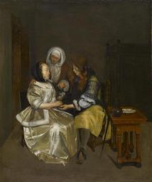 | Keywords: Workshop of Gerard Terborch II - A Glass Of Lemonade - Walters 37341 (2).jpg By the mid-1600s the intimate lives of the middle class joined the raucous lives of the poor as subjects for painting Here an attentive young man tenderly mixes a restorative glass of lemonade for the young woman presumably to convey his own feelings to the love-sick young woman under the watchful eyes of a chaperon Ter Borch was a talented portraitist as well as painter of interiors with figures in satins and other rich fabrics although the effect is diminished here by an over cleaning of the surface decades ago The models for the young people were the artist's half sister and brother Gersina and Moses who were also painters A first version of this composition was painted around 1663 With the assistance of his workshop Ter Borch then made additional versions with small variations between 1666 1668 Baroque Oil on canvas cm 73 7 61 6 accession number 37 341 26676 Charles T Yerkes date and mode of acquisition unknown Charles T Yerkes Sale American Art Association New York 1910 no 134 Henry Walters city Baltimore Walters Art Museum Henry Walters Acquired by Henry Walters 1910 place of origin Netherlands <gallery> File Workshop of Gerard Terborch II - A Glass Of Lemonade - Walters 37341 jpg </gallery> Walters Art Museum license 2D Paintings in the Walters Art Museum Baroque paintings in the Walters Art Museum Media contributed by the Walters Art Museum needs category review The Glass of Lemonade by Gerard ter Borch II |