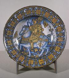 Keywords: Workshop of Giacomo Mancini - DIsh with Constantine the Great - Walters 481740.jpg Constantine was the first Christian Emperor of Rome; his dramatic conversion and military victories made him the ideal Christian soldier He is shown in prayer surrounded by an inscription that translates I commend myself to God This is a piatto di pompe or ceremonial dish distinguished by its impressive size and skillful decoration In the 16th century a group of these large dishes could take the place of fine metal vessels on a sideboard display Painted in cobalt blue and gold-colored luster it reveals the influence of Hispano-Moresque pottery ca 1530 1545 Renaissance earthenware with tin glaze maiolica and luster decoration cm 8 4 40 accession number 48 1740 14434 Normand Collection date and mode of acquisition unknown Henry Walters Baltimore date and mode of acquisition unknown Walters Art Museum Henry Walters Acquired by Henry Walters place of origin Deruta Italy Walters Art Museum license Italian Renaissance maiolica in the Walters Art Museum Media contributed by the Walters Art Museum needs category review Giacomo Mancini Deruta maiolica |