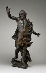 | Keywords: Workshop of Gian Lorenzo Bernini - The Risen Christ - Walters 542281.jpg In 1673 Bernini was commissioned by Pope Clement X to design gilded figures of the twelve apostles and the Risen Christ to crown the tabernacle of the Chapel of the Blessed Sacrament in St Peter's Basilica Working from Bernini's designs Giovanni Rinaldi made the models Girolamo Lucenti the bronze founder had problems casting the Risen Christ and the initial bronze cast had a flaw across its chest This cast now partially repaired and in the Walters' collection was left in a rough state The model was recast gilded and installed in St Peter's Christ's idealized body recalls ancient sculptures of the sun-god Apollo praised as having a perfect physique His striding pose is beautifully balanced while his ascent toward heaven is suggested by the deeply carved fluttering drapery seemingly responding to an invisible wind and creating a strong play of light and shadow Bernini was the greatest sculptor of his age He imbued figures of both metal and marble with an unsurpassed sense of life and motion between 1673 1674 Baroque bronze cm 44 accession number 54 2281 1418 Henry Walters Baltimore formerly in the Baltimore office of Henry Walters date and mode of acquisition unknown C Morgan Marshall date and mode of acquisition unknown Walters Art Museum Gift of C Morgan Marshall 1942 Going for Baroque The Walters Art Gallery Baltimore 1995-1996 Vatican Treasures Early Christian Renaissance and Baroque Art from the Papal Collections The Cleveland Museum of Art Cleveland 1998 A Magnificent Age Masterpieces from the Walters Art Museum Baltimore The Nelson-Atkins Museum of Art Kansas City; Mint Museum of Art Charlotte; The Walters Art Museum Baltimore 2002-2004 The Sculpture of Gianlorenzo Bernini Kimbell Art Museum Fort Worth 1982 The Taste of Maryland Art Collecting in Maryland 1800-1934 The Walters Art Gallery Baltimore 1984 The Allure of Bronze The Walters Art Gallery Baltimore 1995 place of origin Rome Italy Walters Art Museum license Baroque sculpture in the Walters Art Museum Sculptures by Gianlorenzo Bernini Media contributed by the Walters Art Museum needs category review |