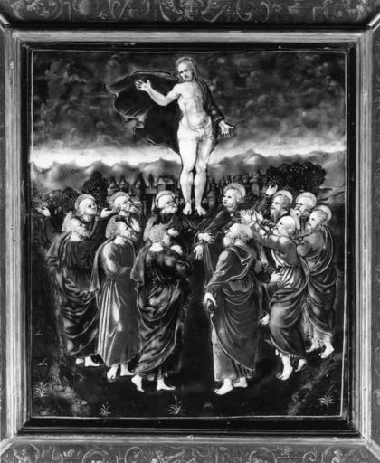 Keywords: Workshop of the Pénicaud family - The Ascension - Walters 4461.jpg The subject may represent the Ascension in the spirit an appearance of Christ to his disciples during his supernatural life after the Resurrection Christ is represented nude clad only in a loincloth and a flowing mantle and showing his wounds The twelve apostles who manifest various expressions of astonishment and rapture are distinguished only by their age They bear no attributes In the background one sees a town and a mountain ridge The figure of Christ seems to have been inspired by that in a painting The Doubting Thomas executed in 1551 by Léonard Limosin for the church of Saint-Pierre-du-Queyroix in Limoges Today this is in the museum at Limoges and was restored in 1963 On the other hand Léonard Limosin may have used for his painting a figure of Christ designed by Jean Pénicaud II for his workshop between 1560 1600 late Renaissance technique painted enamel gold copper cm 20 6 17 4 accession number 44 61 2909 F Spitzer Collection Sale Paris April 17 1893 lot 432 Henry Walters Baltimore date and mode of acquisition unknown Walters Art Museum Henry Walters Acquired by Henry Walters Lost and Found The Secrets of Archimedes The Walters Art Museum Baltimore 2011-2012 place of origin Limoges France Walters Art Museum license Limoges painted enamels in the Walters Art Museum Painted enamel art in the Walters Art Museum Pénicaud family workshop Spitzer Collection Paintings of the Ascension of Christ Loincloths in art |