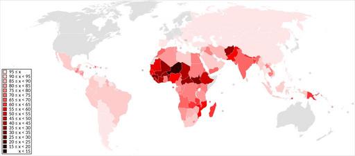 Keywords: World map of countries by literacy rate.svg Editor's note This map is saved in human-editable plain text format to make updating easier for everyone Save and open with Notepad and simply cut and paste the country code from one class to another when updating then save and upload noting your changes Recent Robinson projection SVG map shaded by country using an equally distributed red palette according to their literacy rate x literacy rate and countries without data are light grey File BlankMap-World6 compact svg map and List of countries by literacy rate data 2015-11-02 First uploaded Jolly Janner <gallery> File World map of countries by literacy rate svg Average File World map of countries by male literacy rate svg Male File World map of countries by female literacy rate svg Female File World map of countries by difference in gender literacy rate svg Gender difference </gallery> Maps with Robinson projection Literacy rate maps of the world |