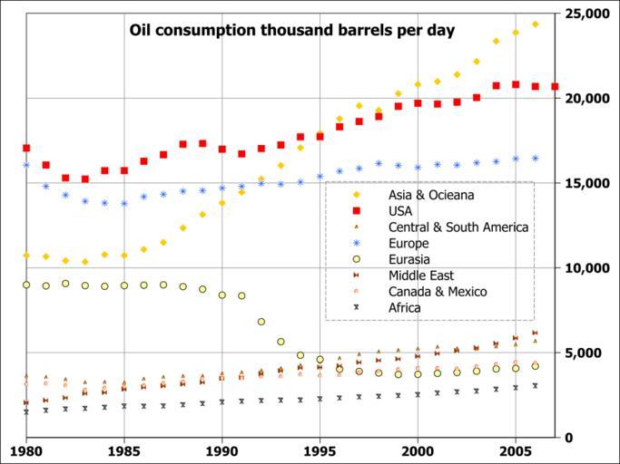 | Keywords: World oil consumption 1980 to 2007 by region.svg Daily oil consumption by region from 1980 to 2006; vertical scale shows thousands of barrels per day and the horizontal scale shows years from 1980 to 2007 I 84user created this work using the excel file RecentPetroleumConsumptionBarrelsperDay xls from the U S Energy Information Administration's web page http //tonto eia doe gov/dnav/pet/pet_pri_wco_k_w htm direct link http //www eia doe gov/emeu/international/RecentPetroleumConsumptionBarrelsperDay xls and using Open Source Gnumeric 1 9 1 to produce the chart 2008-10-24 84user talk 84user Original upload log en wikipedia Skiff CommonsHelper page en wikipedia World_oil_consumption_1980_to_2007_by_region svg 2008-10-24 20 32 84user 600×450× 103638 bytes <nowiki> Daily oil consumption by region from 1980 to 2006; vertical scale shows thousands of barrels per day and the horizontal scale shows years from 1980 to 2007 Related charts Image World oil price in dollars from 1978 to 2008-1</nowiki> Economic information graphics Petroleum statistics |