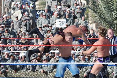 MAKE A MEME View Large Image World Wrestling Entertainment wrestles way to Victory DVIDS134445.jpg en World Wrestling Entertainment Inc superstar John Cena slams Randy Orton during the WWE's Tribute to the Troops as Multi-National Division “ Baghdad and 4th Infantry ...