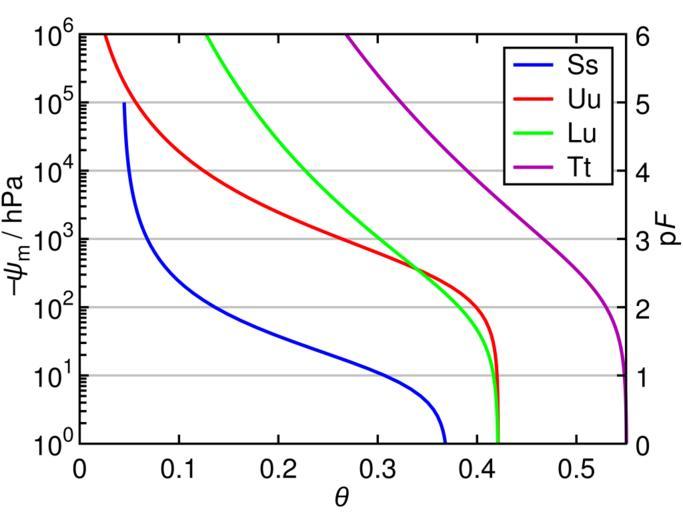 | Keywords: Wrc.svg en calculated diagram of soil with model formula van Genuchten 1980 <ref> cite web https //www bgr bund de/DE/Themen/Boden/Netzwerke/Adhocag/Downloads/Ergaenzungsregel_1_18 pdf Verknüpfungsregel 1 18 “ Parameter für das Modell einer stetigen Funktion der θ ψ -Beziehung 2015-07-29 Ad-hoc-AG Boden 2004-09-17 PDF 242 KiB Staatlichen Geologischen Dienste und BGR German </ref> de neu berechnetes Diagramm verschiedener Bodenarten mit Modelldaten gemäß van Genuchten 1980 own FMoeckel DufterKunde 2015-08-13 http //de wikipedia org/wiki/Datei Wrc svg Wrc jpg o Van Genuchten model of soil water retention <math>\theta</math> “ relative soil water content <math>\Psi_ \mathrm m </math> “ soil matric potential <math> \theta \theta_r + \frac \theta_s - \theta_r \left 1 + \left \alpha\ \frac \left \Psi_ \mathrm m \right \mathrm hPa \right n \right m </math> with <math> m 1 - \frac 1 n \; </math> 1 cellpadding 1 cellspacing 0 +Parameter List Soil Soil <math>\theta_r</math> <math>\theta_r</math> <math>\alpha</math> <math>n</math> <math>m</math> - Ss Sand 0 043019 0 370687 0 087424 1 57535 0 36522 - Uu Silt 0 0 421256 0 003405 1 34475 0 25637 - Lu Loam-Silt 0 0 421217 0 013345 1 12614 0 11201 - Tt Clay 0 0 550541 0 006812 1 08155 0 07540 GNU Octave source code <syntaxhighlight lang octave> function van_genuchten Encdoing UTF-8 Written by DufterKunde https //de wikipedia org/wiki/Benutzer DufterKunde to produce a corrected version of https //commons wikimedia org/wiki/File Wrc svg It is supposed to be run in GNU octave 4 0 but it should also work with older versions of octave as well Only minor changes are needed to make it run with Matlab The plot shows the matric potential Psi_m of different types of soil as a function of the relative soil water content theta It is based on the equation and parameters from cite web https //www bgr bund de/DE/Themen/Boden/Netzwerke/Adhocag/Downloads/Ergaenzungsregel_1_18 pdf Verknüpfungsregel 1 18 “ Parameter für das Modell einer stetigen Funktion der θ ψ -Beziehung 2015-07-29 Ad-hoc-AG Boden 2004-09-17 PDF 242 KiB Staatlichen Geologischen Dienste und BGR German theta theta_r + theta_s - theta_r / 1 + alpha -psi n m with m 1 - 1/n Ss Sand Uu Silt Lu Loam-Silt Tt Clay Compliance of the output with the svg-standard validated by https //validator w3 org/ and practical functionality tested with - Mozilla Firefox for Ubuntu 40 0 - Chromium 43 0 2357 130 Ubuntu 15 04 64-bit - eog Eye of Gnome 3 14 4 - Inkscape 0 91 r13725 and - SVG Check https //tools wmflabs org/svgcheck/ rsvg 2 36 1 parameters pF 0 6; N 10 diff pF + 1; psi -logspace pF 1 pF 2 N ; x 0 0 55; y pF; X 70 550 ; Y 390 30 ; DY diff Y /diff y ; Tick 8; tick 6; lgnd_wdth 95; lgnd_hght 120; lgnd_strk 35; lgnd_pad 4; lgnd_Pad 12; today clock ; Sand theta_r_ss 0 043019; theta_s_ss 0 370687; alpha_ss 0 087424; n_ss 1 57535; theta_ss theta_vg psi theta_r_ss theta_s_ss alpha_ss n_ss ; Silt theta_r_uu 0; theta_s_uu 0 421256; alpha_uu 0 003405; n_uu 1 34475; theta_uu theta_vg psi theta_r_uu theta_s_uu alpha_uu n_uu ; Loam-Silt theta_r_lu 0; theta_s_lu 0 421217; alpha_lu 0 013345; n_lu 1 12614; theta_lu theta_vg psi theta_r_lu theta_s_lu alpha_lu n_lu ; Clay theta_r_tt 0; theta_s_tt 0 550541; alpha_tt 0 006812; n_tt 1 08155; theta_tt theta_vg psi theta_r_tt theta_s_tt alpha_tt n_tt ; generate svg-file fid fopen Wrc svg w ; fprintf fid < xml version \ 1 0\ encoding \ utf-8\ >\n <svg\n xmlns \ http //www w3 org/2000/svg\ \n width \ 600\ height \ 450\ \n >\n \t<title>Water Retention Curves</title>\n ; fprintf fid \t<desc>\n \t\t This is a corrected version of\n \t\t https //commons wikimedia org/wiki/File Wrc svg\n \t\t generated by DufterKunde\n \t\t https //de wikipedia org/wiki/Benutzer DufterKunde\n \t\t on i- 02i- 02i \n \t\t The plot shows the matric potential Psi_m\n \t\t of different types of soil as a function of the\n \t\t relative soil water content theta \n \t\t It is based on the equation and parameters from\n \t\t cite web\n \t\t https //www bgr bund de/DE/Themen/Boden/Netzwerke/Adhocag/Downloads/Ergaenzungsregel_1_18 pdf\n \t\t Verknüpfungsregel 1 18 “ Parameter für das Modell einer stetigen Funktion der θ ψ -Beziehung\n \t\t 2015-07-29\n \t\t Ad-hoc-AG Boden\n \t\t \n \t\t 2004-09-17\n \t\t PDF 242 KiB\n \t\t Staatlichen Geologischen Dienste und BGR\n \t\t German\n \t\t \n \t\t theta theta_r + theta_s - theta_r / 1 + alpha -psi n m\n \t\t with\n \t\t m 1 - 1/n \n \t\t Ss Sand Uu Silt Lu Loam-Silt Tt Clay \n \t\t This svg-file has been generated line-by-line\n \t\t by a GNU Octave function \n \t\t Compliance with the svg standard validated by \n \t\t https //validator w3 org/\n \t\t and practical functionality tested with\n \t\t - Mozilla Firefox for Ubuntu 40 0 \n \t\t - Chromium 43 0 2357 130 Ubuntu 15 04 64-bit \n \t\t - eog Eye of Gnome 3 14 4 \n \t\t - Inkscape 0 91 r13725 and\n \t\t - SVG Check https //tools wmflabs org/svgcheck/ rsvg 2 36 1 \n \t</desc>\n today 1 today 2 today 3 ; fprintf fid \t<g shape-rendering \ geometricPrecision\ stroke \ black\ stroke-width \ 2\ >\n ; fprintf fid \t\t\n ; fprintf fid \t\t<g stroke \ c0c0c0\ >\n ; for k pF 1 + 1 pF 2 - 1 Y_grid Y 1 + k DY fprintf fid \t\t\t<polyline points \ i i i i\ />\n X 1 Y_grid X 2 Y_grid ; endfor fprintf fid \t\t</g>\n ; fprintf fid \t\t\n ; fprintf fid \t\t<g fill \ none\ stroke-width \ 3\ >\n ; write_svg_dat fid psi 1 end-10 theta_ss 1 end-10 x y X Y 0000ff Ss Sand ; write_svg_dat fid psi theta_uu x y X Y ff0000 Uu Silt ; write_svg_dat fid psi theta_lu x y X Y 00ff00 Lu Loam-Silt ; write_svg_dat fid psi theta_tt x y X Y b000b0 Tt Clay ; fprintf fid \t\t</g>\n ; fprintf fid \t\t\n ; for k 0 1 0 1 0 5 X_grid X 1 + k diff X /diff x fprintf fid \t\t<polyline points \ 5 2f i 5 2f i\ />\n X_grid Y 1 X_grid Y 1 -Tick ; fprintf fid \t\t<polyline points \ 5 2f i 5 2f i\ />\n X_grid Y 2 +Tick X_grid Y 2 ; endfor fprintf fid \t\t\n ; for k pF 1 + 1 pF 2 - 1 Y_grid Y 1 + k DY; fprintf fid \t\t<polyline points \ i i