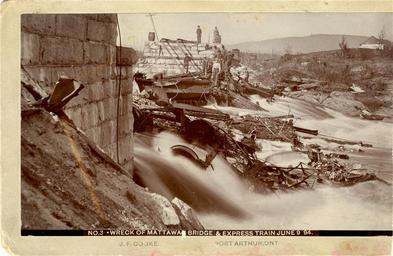 | Keywords: bridge disaster train wreck trainwreck j f cooke jfcooke unidentified person unidentifiedperson photo border This photograph, dated June 9, 1894, is labelled "Number 3: Wreck of Mattawan Bridge & Express Train." The photograph shows debris partly submerged in a swift-flowing river, with remains of the bridge and onlookers. The photographer is J.F. Cooke of Port Arthur, Ontario. Accession 1991-01 #101 This photograph is in the public domain as all copyright has expired. For more information about Thunder Bay's history, visit www.thunderbay.ca/archives This photograph, dated June 9, 1894, is labelled "Number 3: Wreck of Mattawan Bridge & Express Train." The photograph shows debris partly submerged in a swift-flowing river, with remains of the bridge and onlookers. The photographer is J.F. Cooke of Port Arthur, Ontario. Accession 1991-01 #101 This photograph is in the public domain as all copyright has expired. For more information about Thunder Bay's history, visit www.thunderbay.ca/archives |