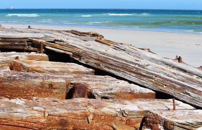 Keywords: wreck wood metal rusted eyelet weathered decay beach
