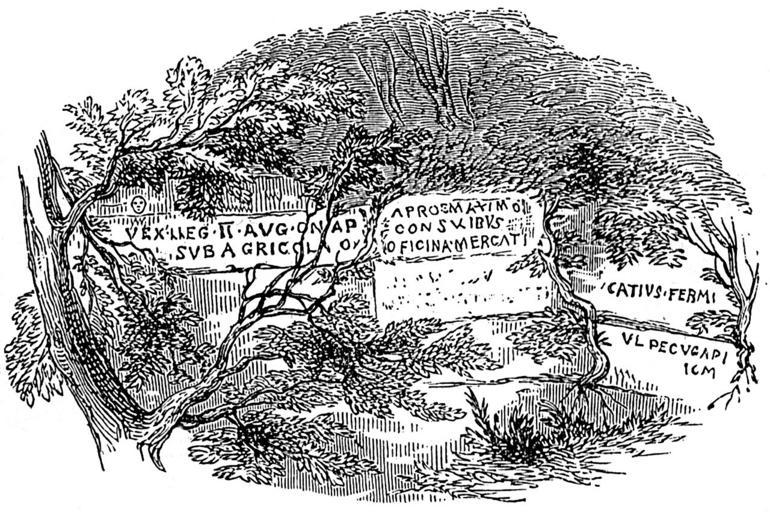 | Keywords: hadrian's hadrians wall roman frontier limes quarry inscription gelt cumbria western sector westernsector hwfeed monochrome blackandwhite drawing white background black and white Quarry inscriptions near Brampton (Cumbria), by the side of the River Gelt, sometimes mischievously known as the Rotten Wreck of Guilt. The inscriptions (RIB 1007--15) date it to AD 207 and, presumably, the Severan restoration of the curtain wall. Scanned from the 1921 8th edition of the Handbook to the Roman Wall. Handbook p.329 Quarry inscriptions near Brampton (Cumbria), by the side of the River Gelt, sometimes mischievously known as the Rotten Wreck of Guilt. The inscriptions (RIB 1007--15) date it to AD 207 and, presumably, the Severan restoration of the curtain wall. Scanned from the 1921 8th edition of the Handbook to the Roman Wall. Handbook p.329 |