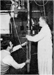 Keywords: Wu experiment at Bureau of Standards.jpg Wu experiment an elementary particle experiment performed by American physicist Chien-Shiung Wu at the US National Bureau of Standards now NIST in 1956 that established the nonconservation of parity in elementary particle reactions involving the weak force Tsung-Dao Lee and Chen-Ning Yang the theoretical physicists who originated the idea of parity nonconservation and proposed the experiment were awarded the 1957 Nobel Prize in physics for this result In the experiment the intensity of gamma rays emitted by the radioactive isotope en cobalt 60 cooled to near absolute zero and placed in a magnetic field was measured The picture shows the column containing the cobalt-60 detectors and magnetizing coil being slid into a glass Dewar flask before being inserted in the large magnet in background which will cool the sample to cryogenic temperatures <br /><br /> Caption Low temperature experiments at the Bureau demonstrated that the quantum mechanical law of conservation of parity does not hold in the beta decay of cobalt-60 nuclei Apparatus used in the parity studies An outer dewar flask is being place on a glass vacuum chamber containing a sample of radioactive cobalt-60 The large magnet in the background cools the sample almost to absolute zero by adiabatic demagnetization The magnetic field of a solenoid is then used to polarize the cobalt nuclei 1957 Retrieved January 29 2014 from http //books google com/books id 2d1th30kedoC pg RA2-PA22 Annual Report of the National Bureau of Standards for 1957 miscellaneous publication 227 US Government Printing Office Washington D C p 22 reprinted in Research Highlights of the National Bureau of Standards on Google Books A V Astin Director Bureau of Standards CleanFFT PD-USGov Uploaded with UploadWizard Spin intrinsic angular momentum Physics experiments |