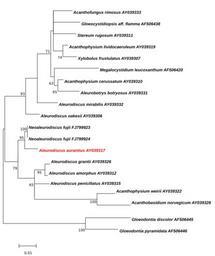 | Keywords: Wu-Neoaleurodiscus-Maximum Likelihood-Tree.svg Figure Molecular Phylogenetic analysis by the Maximum Likelihood method of Acanthobasidium Aleurodiscus s s and Neoaleurodiscus The evolutionary history was inferred by using the Maximum Likelihood method based on the Tamura-Nei model 1 The tree with the highest log likelihood -2842 6486 is shown The percentage of trees in which the associated taxa clustered together is shown next to the branches Initial tree s for the heuristic search were obtained by applying the Neighbor-Joining method to a matrix of pairwise distances estimated using the Maximum Composite Likelihood MCL approach A discrete Gamma distribution was used to model evolutionary rate differences among sites 5 categories +G parameter 0 1738 The rate variation model allowed for some sites to be evolutionarily invariable +I 68 6716 sites The tree is drawn to scale with branch lengths measured in the number of substitutions per site The analysis involved 20 nucleotide sequences There were a total of 964 positions in the final dataset Evolutionary analyses were conducted in http //megasoftware net/ MEGA6 2 <br/> For all taxa the GenBank number of the DNA-sequence is shown For the tree the same sequences are used which Sheng-Hua Wu used for his most parsimonious tree 5 In addition the sequence of Aleurodiscus aurantius AY039317 in red was used for the calculation of the LM-tree <br/> <br/> 1 Tamura K and Nei M 1993 Estimation of the number of nucleotide substitutions in the control region of mitochondrial DNA in humans and chimpanzees Molecular Biology and Evolution 10 512-526 <br/> 2 Tamura K Stecher G Peterson D Filipski A and Kumar S 2013 MEGA6 Molecular Evolutionary Genetics Analysis version 6 0 Molecular Biology and Evolution30 2725-2729 <br/> 3 Sheng-Hua Wu Dong-Mei Wang Shi-Yi Yu Neoaleurodiscus fujii a new genus and new species found at the timberline in Japan In The Mycological Society of America Hrsg Mycologia Vol 102 1 Lawrence 2010 S 217 “223<br/> ; List with GenBank Sequences http //www ncbi nlm nih gov/nuccore/AY039326 Aleurodiscus grantii strain T569 http //www ncbi nlm nih gov/nuccore/AY039312 Aleurodiscus amorphus strain HHB15282 http //www ncbi nlm nih gov/nuccore/AF506397 Aleurodiscus amorphus - AF506397 http //www ncbi nlm nih gov/nuccore/AY039315 Acanthobasicium penicillatum strain T322 http //www ncbi nlm nih gov/nuccore/AY039322 Aleurodiscus weirii strain HHB12678 http //www ncbi nlm nih gov/nuccore/AY039328 Acanthobasidium norvegicum strain T623 http //www ncbi nlm nih gov/nuccore/AY039317 Aleurodiscus aurantius strain T621 http //www ncbi nlm nih gov/nuccore/FJ799924 Neoaleurodiscus fujii strain Wu0807-41 http //www ncbi nlm nih gov/nuccore/FJ799923 Neoaleurodiscus fujii strain Wu0807-40 http //www ncbi nlm nih gov/nuccore/AF506445 Gloeodontia discolor AF506445 http //www ncbi nlm nih gov/nuccore/AF506446 Gloeodontia pyramidata AF506446 http //www ncbi nlm nih gov/nuccore/AY039333 Acanthofungus rimosus AY039333 http //www ncbi nlm nih gov/nuccore/AY039311 Stereum rugosum AY039311 http //www ncbi nlm nih gov/nuccore/AY039319 Acanthophysium lividocaeruleum AY039319 http //www ncbi nlm nih gov/nuccore/AY039307 Xylobolus frustulatus AY039307 http //www ncbi nlm nih gov/nuccore/AY039310 Acanthophysium cerussatum AY039310 http //www ncbi nlm nih gov/nuccore/AY039331 Aleurobotrys botryosus AY039331 http //www ncbi nlm nih gov/nuccore/AF506438 Gloeocystidiopsis aff flamma AF506438 http //www ncbi nlm nih gov/nuccore/AY039332 Aleurodiscus mirabilis AY039332 http //www ncbi nlm nih gov/nuccore/AY039306 Aleurodiscus oakesii AY039306 http //www ncbi nlm nih gov/nuccore/AF506420 Megalocystidium leucoxanthum AF506420 own 2014-08-24 Thkgk Cc-zero Acanthobasidium Aleurodiscus penicillatus Aleurodiscus Neoaleurodiscus |