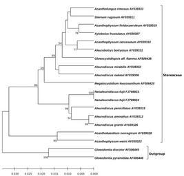 | Keywords: Wu-UPGMA-Tree-Acanthobasidium-Aleurodiscus-Neoaleurodiscus.svg Figure Evolutionary relationships of Acanthobasidium Aleurodiscus s s and Neoaleurodiscus The evolutionary history was inferred using the UPGMA method 1 The optimal tree with the sum of branch length 0 27259509 is shown The percentage of replicate trees in which the associated taxa clustered together in the bootstrap test 1000 replicates are shown next to the branches Only Bootstrap values more than 50 are shown 2 The tree is drawn to scale with branch lengths in the same units as those of the evolutionary distances used to infer the phylogenetic tree The evolutionary distances were computed using the Kimura 2-parameter method 3 and are in the units of the number of base substitutions per site The analysis involved 19 nucleotide sequences All positions with less than 95 site coverage were eliminated That is fewer than 5 alignment gaps missing data and ambiguous bases were allowed at any position There were a total of 812 positions in the final dataset Evolutionary analyses were conducted in MEGA6 4 <br/> For all taxa the GenBank number of the DNA-sequence is shown For the tree the same sequences are used which Sheng-Hua Wu used for his most parsimonious tree 5<br/> <br/> 1 Sneath P H A and Sokal R R 1973 Numerical Taxonomy Freeman San Francisco <br/> 2 Felsenstein J 1985 Confidence limits on phylogenies An approach using the bootstrap Evolution 39 783-791 <br/> 3 Kimura M 1980 A simple method for estimating evolutionary rate of base substitutions through comparative studies of nucleotide sequences Journal of Molecular Evolution 16 111-120 <br/> 4 Tamura K Stecher G Peterson D Filipski A and Kumar S 2013 MEGA6 Molecular Evolutionary Genetics Analysis version 6 0 Molecular Biology and Evolution30 2725-2729 <br/> 5 Sheng-Hua Wu Dong-Mei Wang Shi-Yi Yu Neoaleurodiscus fujii a new genus and new species found at the timberline in Japan In The Mycological Society of America Hrsg Mycologia Vol 102 1 Lawrence 2010 S 217 “223<br/> ; List with GenBank Sequences http //www ncbi nlm nih gov/nuccore/AY039326 Aleurodiscus grantii strain T569 http //www ncbi nlm nih gov/nuccore/AY039312 Aleurodiscus amorphus strain HHB15282 http //www ncbi nlm nih gov/nuccore/AF506397 Aleurodiscus amorphus - AF506397 http //www ncbi nlm nih gov/nuccore/AY039315 Acanthobasicium penicillatum strain T322 http //www ncbi nlm nih gov/nuccore/AY039322 Aleurodiscus weirii strain HHB12678 http //www ncbi nlm nih gov/nuccore/AY039328 Acanthobasidium norvegicum strain T623 http //www ncbi nlm nih gov/nuccore/AY039317 Acanthobasidium aurantius strain T621 http //www ncbi nlm nih gov/nuccore/FJ799924 Neoaleurodiscus fujii strain Wu0807-41 http //www ncbi nlm nih gov/nuccore/FJ799923 Neoaleurodiscus fujii strain Wu0807-40 http //www ncbi nlm nih gov/nuccore/AF506445 Gloeodontia discolor AF506445 http //www ncbi nlm nih gov/nuccore/AF506446 Gloeodontia pyramidata AF506446 http //www ncbi nlm nih gov/nuccore/AY039333 Acanthofungus rimosus AY039333 http //www ncbi nlm nih gov/nuccore/AY039311 Stereum rugosum AY039311 http //www ncbi nlm nih gov/nuccore/AY039319 Acanthophysium lividocaeruleum AY039319 http //www ncbi nlm nih gov/nuccore/AY039307 Xylobolus frustulatus AY039307 http //www ncbi nlm nih gov/nuccore/AY039310 Acanthophysium cerussatum AY039310 http //www ncbi nlm nih gov/nuccore/AY039331 Aleurobotrys botryosus AY039331 http //www ncbi nlm nih gov/nuccore/AF506438 Gloeocystidiopsis aff flamma AF506438 http //www ncbi nlm nih gov/nuccore/AY039332 Aleurodiscus mirabilis AY039332 http //www ncbi nlm nih gov/nuccore/AY039306 Aleurodiscus oakesii AY039306 http //www ncbi nlm nih gov/nuccore/AF506420 Megalocystidium leucoxanthum AF506420 own 2014-08-19 Thkgk Cc-zero Acanthobasidium Aleurodiscus penicillatus Aleurodiscus Neoaleurodiscus |