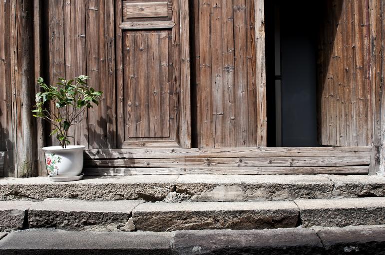 Keywords: wuzhen building ancient architecture china wind antiquity the ming and qing dynasties huizhou architecture wood frame wooden line door brown potted plants plant green stairs
