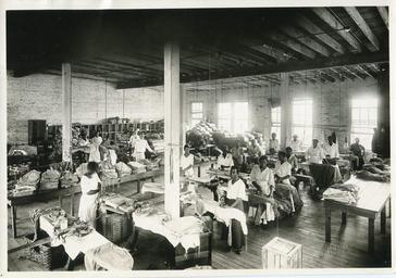| Keywords: wwi raleigh united states laundry unitedstateslaundry women african american africanamerican Interior view of the clothes repair, pressing, and packing room in a warehouse building at the United States Laundry in Raleigh, N.C. Most of the workers pictured are African-American women, working in a room without fans or air circulation. The laundry cleaned, pressed, and repaired the clothes for military personnel at various military cantonments; Camp Sevier in South Carolina; Camp Greene in Charlotte, N.C.; and Camp Jackson in South Carolina. It operated 24-hours a day, and employed 120 people (undated) [Photograph by: Ellington, Raleigh, N.C.]. From Box 11, North Carolina County War Records, WWI 2, WWI Papers, Military Collection, State Archives of North Carolina. Interior view of the clothes repair, pressing, and packing room in a warehouse building at the United States Laundry in Raleigh, N.C. Most of the workers pictured are African-American women, working in a room without fans or air circulation. The laundry cleaned, pressed, and repaired the clothes for military personnel at various military cantonments; Camp Sevier in South Carolina; Camp Greene in Charlotte, N.C.; and Camp Jackson in South Carolina. It operated 24-hours a day, and employed 120 people (undated) [Photograph by: Ellington, Raleigh, N.C.]. From Box 11, North Carolina County War Records, WWI 2, WWI Papers, Military Collection, State Archives of North Carolina. |