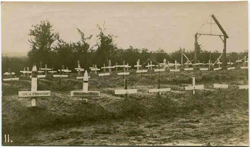 | Keywords: the great war thegreatwar great war greatwar world war i worldwari world war one worldwarone the first world war thefirstworldwar wwi ww1 grave marker gravemarker wooden crosses woodencrosses military cemetery militarycemetery a.c. copeman accopeman copeman toul france toul, france toulfrance outdoor View of an American cemetery on a battlefield near Toul, France, during World War I, featuring makeshift wooden crosses made from fence posts as grave markers. A grave marker for a Corporal A.C. Copeman is pictured. Caption on back reads in Henry Graves handwriting: “An American cemetery near Toul, France” (circa 1918) [Photograph taken or collected by Henry L. Graves].  --From Henry L. Graves Papers, WWI 55, Military Collection, State Archives of North Carolina View of an American cemetery on a battlefield near Toul, France, during World War I, featuring makeshift wooden crosses made from fence posts as grave markers. A grave marker for a Corporal A.C. Copeman is pictured. Caption on back reads in Henry Graves handwriting: “An American cemetery near Toul, France” (circa 1918) [Photograph taken or collected by Henry L. Graves].  --From Henry L. Graves Papers, WWI 55, Military Collection, State Archives of North Carolina |