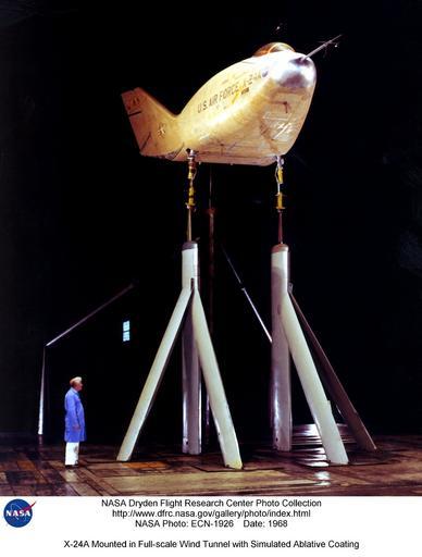 Keywords: X-24A Mounted in Full-scale Wind Tunnel with Simulated Ablative Coating DVIDS706900.jpg en This photo shows a technician dwarfed beside the X-24A in a full-scale wind tunnel The X-24A is white in this photo because it is covered with a simulated ablative coating which was being investigated as a possible method of protecting vehicles from the heat of high-speed flight The X-24 was one of a group of lifting bodies flown by the NASA Flight Research Center now Dryden Flight Research Center Edwards California in a joint program with the U S Air Force at Edwards Air Force Base from 1963 to 1975 The lifting bodies were used to demonstrate the ability of pilots to maneuver and safely land wingless vehicles designed to fly back to Earth from space and be landed like an airplane at a predetermined site Lifting bodies' aerodynamic lift essential to flight in the atmosphere was obtained from their shape The addition of fins and control surfaces allowed the pilots to stabilize and control the vehicles and regulate their flight paths Built by Martin Aircraft Company Maryland for the U S Air Force the X-24A was a bulbous vehicle shaped like a teardrop with three vertical fins at the rear for directional control It weighed 6 270 pounds was 24 5 feet long and 11 5 feet wide measuring just the fuselage not the distance between the tips of the outboard fins Its first unpowered glide flight was on April 17 1969 with Air Force Maj Jerauld Gentry at the controls Gentry also piloted its first powered flight on March 19 1970 The X-24A was flown 28 times in the program that like the HL-10 validated the concept that a Space Shuttle vehicle could be landed unpowered The fastest speed achieved by the X-24A was 1 036 miles per hour mph--Mach 1 6 Its maximum altitude was 71 400 feet It was powered by an XLR-11 rocket engine with a maximum theoretical vacuum thrust of 8 480 pounds The X-24A was later modified into the X-24B The bulbous shape of the X-24A was converted into a flying flatiron shape with a rounded top flat bottom and double delta platform that ended in a pointed nose The X-24B demonstrated that accurate unpowered reentry vehicle landings were operationally feasible Top speed achieved by the X-24B was 1 164 mph and the highest altitude it reached was 74 130 feet The vehicle is on display at the Air Force Museum Wright-Patterson Air Force Base Ohio The pilot on the last powered flight of the X-24B was Bill Dana who also flew the last X-15 flight about seven years earlier The X-24A shape was later borrowed for the X-38 Crew Return Vehicle CRV technology demonstrator for the International Space Station NASA Identifier NIX-ECN-1926 2009-09-23 Glenn Research Center https //www dvidshub net/image/706900 706900 2012-10-10 16 04 WASHINGTON DC US PD-USGov Edwards Air Force Base Wright-Patterson Air Force Base Images from DoD uploaded by Fæ |