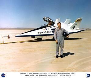 Keywords: X-24B with Test Pilot Tom McMurtry DVIDS727674.jpg en In this 1975 photo research pilot Thomas C McMurtry stands in front of the X-24B on Rogers Dry lake adjacent to the NASA Flight Research Center Edwards California A former U S Navy pilot and graduate of the U S Navy Test Pilot School Patuxent River Maryland McMurtry was a consultant for Lockheed Corporation before joining NASA in 1967 The X-24B was the last aircraft to fly in Dryden's manned lifting body program The X-24B is on public display at the Air Force Museum Wright-Patterson AFB Ohio The X-24 was one of a group of lifting bodies flown by the NASA Flight Research Center now Dryden Flight Research Center Edwards California in a joint program with the U S Air Force at Edwards Air Force Base from 1963 to 1975 The lifting bodies were used to demonstrate the ability of pilots to maneuver and safely land wingless vehicles designed to fly back to Earth from space and be landed like an airplane at a predetermined site Lifting bodies' aerodynamic lift essential to flight in the atmosphere was obtained from their shape The addition of fins and control surfaces allowed the pilots to stabilize and control the vehicles and regulate their flight paths Built by Martin Aircraft Company Maryland for the U S Air Force the X-24A was a bulbous vehicle shaped like a teardrop with three vertical fins at the rear for directional control It weighed 6 270 pounds was 24 5 feet long and 11 5 feet wide measuring just the fuselage not the distance between the tips of the outboard fins Its first unpowered glide flight was on April 17 1969 with Air Force Maj Jerauld Gentry at the controls Gentry also piloted its first powered flight on March 19 1970 The X-24A was flown 28 times in the program that like the HL-10 validated the concept that a Space Shuttle vehicle could be landed unpowered The fastest speed achieved by the X-24A was 1 036 miles per hour mph-Mach 1 6 Its maximum altitude was 71 400 feet It was powered by an XLR-11 rocket engine with a maximum theoretical vacuum thrust of 8 480 pounds The X-24A was later modified into the X-24B The bulbous shape of the X-24A was converted into a flying flatiron shape with a rounded top flat bottom and double delta platform that ended in a pointed nose The X-24B demonstrated that accurate unpowered reentry vehicle landings were operationally feasible Top speed achieved by the X-24B was 1 164 mph and the highest altitude it reached was 74 130 feet The vehicle is on display at the Air Force Museum Wright-Patterson Air Force Base Ohio The pilot on the last powered flight of the X-24B was Bill Dana who also flew the last X-15 flight about seven years earlier The X-24A shape was later borrowed for the X-38 Crew Return Vehicle CRV technology demonstrator for the International Space Station NASA Identifier NIX-ECN-4922 2009-09-23 Glenn Research Center https //www dvidshub net/image/727674 727674 2012-10-17 14 11 WASHINGTON DC US PD-USGov Aircraft at Rogers Dry Lake Images from DoD uploaded by Fæ Martin-Marietta X-24 |