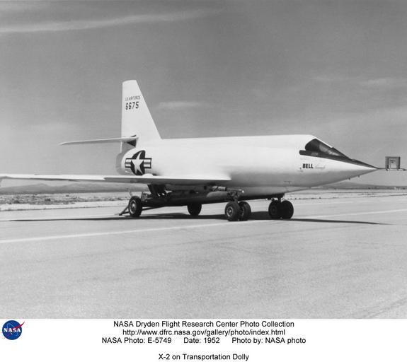 Keywords: X-2 on Transportation Dolly DVIDS734540.jpg en This 1952 photograph shows the X-2 2 aircraft mounted on a special transportation dolly at Edwards Air Force Base California The dolly was steerable and was used for transporting the X-2 around and for towing it off the lakebed at Edwards Air Force Base after a landing This was the number 2 airplane 46-675 which was lost on May 12 1953 on a captive flight over Lake Ontario when the airplane exploded during a liquid-oxygen topoff test killing the pilot Jean Ziegler and EB-50A crewman Frank Wolko Almost no debris was recovered from Lake Ontario so no cause for the explosion could be determined Later however investigations of similar explosions in the X-1 3 X-1A and X-1D traced the problem to Ulmer leather gaskets which exuded tricresyl phosphate This substance caused detonations in the supercold atmosphere of the airplanes' liquid oxygen tanks As the X-2 2 also had these gaskets they were probably the cause of the explosion in that aircraft as well The X-2 was a swept-wing rocket-powered aircraft designed to fly faster than Mach 3 three times the speed of sound It was built for the U S Air Force by the Bell Aircraft Company Buffalo New York The X-2 was flown to investigate the problems of aerodynamic heating as well as stability and control effectiveness at high altitudes and high speeds in excess of Mach 3 Bell aircraft built two X-2 aircraft These were constructed of K-monel a copper and nickel alloy for the fuselage and stainless steel for the swept wings and control surfaces The aircraft had ejectable nose capsules instead of ejection seats because the development of ejection seats had not reached maturity at the time the X-2 was conceived The X-2 ejection canopy was successfully tested using a German V-2 rocket The X-2 used a skid-type landing gear to make room for more fuel The airplane was air launched from a modified Boeing B-50 Superfortress Bomber X-2 Number 1 made its first unpowered glide flight on Aug 5 1954 and made a total of 17 4 glide and 13 powered flights before it was lost Sept 27 1956 The pilot on Flight 17 Capt Milburn Apt had flown the aircraft to a record speed of Mach 3 2 2 094 mph thus becoming the first person to exceed Mach 3 During that last flight inertial coupling occurred and the pilot was killed The aircraft suffered little damage in the crash resulting in proposals never implemented from the Langley Memorial Aeronautical Laboratory Hampton Virginia to rebuild it for use in a hypersonic Mach 5+ test program In 1953 X-2 Number 2 was lost in an in-flight explosion while at the Bell Aircraft Company during captive flight trials and was jettisoned into Lake Ontario The Air Force had previously flown the aircraft on three glide flights at Edwards Air Force Base California in 1952 Although the NACA's High-Speed Flight Station Edwards California predecessor of NASA's Dryden Flight Research Center never actually flew the X-2 aircraft the NACA did support the program primarily through Langley Memorial Aeronautical Laboratory wind-tunnel tests and Wallops Island Virginia rocket-model tests The NACA High-Speed Flight Station also provided stability-and-control recording instrumentation and simulator support for the Air Force flights In the latter regard the NACA worked with the Air Force in using a special computer to extrapolate and predict aircraft behavior from flight data NASA Identifier NIX-E-5749 2009-09-23 Glenn Research Center https //www dvidshub net/image/734540 734540 2012-10-17 20 29 WASHINGTON DC US PD-USGov Aircraft at Rogers Dry Lake Images from DoD uploaded by Fæ Bell X-2