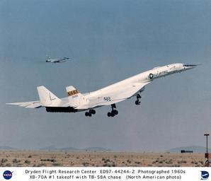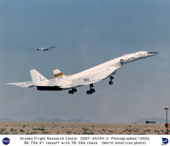 Keywords: aviation aerospace national aeronautics and space administration nationalaeronauticsandspaceadministration nasa airplane aircraft bomber north american aviation northamericanaviation naa north american b-70 valkyrie northamericanb70valkyrie north american b-70 northamericanb70 north american valkyrie northamericanvalkyrie b-70 valkyrie b70valkyrie north american xb-70 valkyrie northamericanxb70valkyrie north american xb-70 northamericanxb70 xb-70 valkyrie xb70valkyrie north american xb-70a valkyrie northamericanxb70avalkyrie north american xb-70a northamericanxb70a xb-70a valkyrie xb70avalkyrie b-70 b70 b-70a b70a xb-70 xb70 xb-70a xb70a valkyrie general electric generalelectric ge general electric j93 generalelectricj93 ge j93 gej93 general electric yj-93 generalelectricyj93 ge yj-93 geyj93 j-93 j93 yj-93 yj93 af 62-0001 af620001 62-0001 620001 convair b-58 hustler convairb58hustler convair b-58 convairb58 convair hustler convairhustler b-58 hustler b58hustler tb-58 tb58 ge j-79 gej79 j-79 j79 convair tb-58 convairtb58 convair tb-58a convairtb58a tb-58a tb58a armstrong afrc nasa armstrong nasaarmstrong vehicle outdoor airliner jet jetliner jumbo jet Description: This photo shows XB-70A #1 taking off on a research flight, escorted by a TB-58 chase plane. The TB-58 (a prototype B-58 modified as a trainer) had a dash speed of Mach 2. This allowed it to stay close to the XB-70 as it conducted its research maneuvers. When the XB-70 was flying at or near Mach 3, the slower TB-58 could often keep up with it by flying lower and cutting inside the turns in the XB-70's flight path when these occurred. The XB-70 was the world's largest experimental aircraft. It was capable of flight at speeds of three times the speed of sound (roughly 2,000 miles per hour) at altitudes of 70,000 feet. It was used to collect in-flight information for use in the design of future supersonic aircraft, military and civilian. The major objectives of the XB-70 flight research program were to study the airplane's stability and handling characteristics, to evaluate its response to atmospheric turbulence, and to determine the aerodynamic and propulsion performance. In addition there were secondary objectives to measure the noise and friction associated with airflow over the airplane and to determine the levels and extent of the engine noise during takeoff, landing, and ground operations. The XB-70 was about 186 feet long, 33 feet high, with a wingspan of 105 feet. Originally conceived as an advanced bomber for the United States Air Force, the XB-70 was limited to production of two aircraft when it was decided to limit the aircraft's mission to flight research. The first flight of the XB-70 was made on September 21, 1964. The number two XB-70 was destroyed in a mid-air collision on June 8, 1966. Program management of the NASA-USAF research effort was assigned to NASA in March 1967. The final flight was flown on February 4, 1969. Designed by North American Aviation (later North American Rockwell and still later, a division of Boeing) the XB-70 had a long fuselage with a canard or horizontal stabilizer mounted just behind the crew compartment. It had a sharply swept 65.6-percent delta wing. The outer portion of the wing could be folded down in flight to provide greater lateral-directional stability. The airplane had two windshields. A moveable outer windshield was raised for high-speed flight to reduce drag and lowered for greater visibility during takeoff and landing. The forward fuselage was constructed of riveted titanium frames and skin. The remainder of the airplane was constructed almost entirely of stainless steel. The skin was a brazed stainless-steel honeycomb material. Six General Electric YJ93-3 turbojet engines, each in the 30,000-pound-thrust class, powered the XB-70. Internal geometry of the inlets was controllable to maintain the most efficient airflow to the engines. UID: SPD-NIX-ED97-44244-2 Date: February 4, 1969 Description: This photo shows XB-70A #1 taking off on a research flight, escorted by a TB-58 chase plane. The TB-58 (a prototype B-58 modified as a trainer) had a dash speed of Mach 2. This allowed it to stay close to the XB-70 as it conducted its research maneuvers. When the XB-70 was flying at or near Mach 3, the slower TB-58 could often keep up with it by flying lower and cutting inside the turns in the XB-70's flight path when these occurred. The XB-70 was the world's largest experimental aircraft. It was capable of flight at speeds of three times the speed of sound (roughly 2,000 miles per hour) at altitudes of 70,000 feet. It was used to collect in-flight information for use in the design of future supersonic aircraft, military and civilian. The major objectives of the XB-70 flight research program were to study the airplane's stability and handling characteristics, to evaluate its response to atmospheric turbulence, and to determine the aerodynamic and propulsion performance. In addition there were secondary objectives to measure the noise and friction associated with airflow over the airplane and to determine the levels and extent of the engine noise during takeoff, landing, and ground operations. The XB-70 was about 186 feet long, 33 feet high, with a wingspan of 105 feet. Originally conceived as an advanced bomber for the United States Air Force, the XB-70 was limited to production of two aircraft when it was decided to limit the aircraft's mission to flight research. The first flight of the XB-70 was made on September 21, 1964. The number two XB-70 was destroyed in a mid-air collision on June 8, 1966. Program management of the NASA-USAF research effort was assigned to NASA in March 1967. The final flight was flown on February 4, 1969. Designed by North American Aviation (later North American Rockwell and still later, a division of Boeing) the XB-70 had a long fuselage with a canard or horizontal stabilizer mounted just behind the crew compartment. It had a sharply swept 65.6-perc