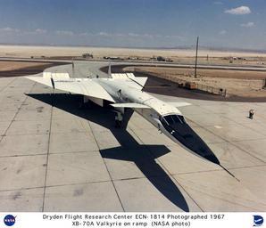 | Keywords: XB-70A parked on ramp DVIDS709611.jpg en This photo shows the XB-70A parked on a ramp at Edwards Air Force Base in 1967 Originally designed as a Mach 3 bomber the XB-70A never went into production and instead was used for flight research involving the Air Force and NASA's Flight Research Center FRC which was a predecessor of today's NASA Dryden Flight Research Center The aircraft's shadow indicates its unusual planform This featured two canards behind the cockpit followed by a large triangular delta wing The outboard portions of the wing were hinged so they could be folded down for improved high-speed stability The XB-70 was the world's largest experimental aircraft It was capable of flight at speeds of three times the speed of sound roughly 2 000 miles per hour at altitudes of 70 000 feet It was used to collect in-flight information for use in the design of future supersonic aircraft military and civilian The major objectives of the XB-70 flight research program were to study the airplane's stability and handling characteristics to evaluate its response to atmospheric turbulence and to determine the aerodynamic and propulsion performance In addition there were secondary objectives to measure the noise and friction associated with airflow over the airplane and to determine the levels and extent of the engine noise during takeoff landing and ground operations The XB-70 was about 186 feet long 33 feet high with a wingspan of 105 feet Originally conceived as an advanced bomber for the United States Air Force the XB-70 was limited to production of two aircraft when it was decided to limit the aircraft's mission to flight research The first flight of the XB-70 was made on Sept 21 1964 The number two XB-70 was destroyed in a mid-air collision on June 8 1966 Program management of the NASA-USAF research effort was assigned to NASA in March 1967 The final flight was flown on Feb 4 1969 Designed by North American Aviation later North American Rockwell and still later a division of Boeing the XB-70 had a long fuselage with a canard or horizontal stabilizer mounted just behind the crew compartment It had a sharply swept 65 6-percent delta wing The outer portion of the wing could be folded down in flight to provide greater lateral-directional stability The airplane had two windshields A moveable outer windshield was raised for high-speed flight to reduce drag and lowered for greater visibility during takeoff and landing The forward fuselage was constructed of riveted titanium frames and skin The remainder of the airplane was constructed almost entirely of stainless steel The skin was a brazed stainless-steel honeycomb material Six General Electric YJ93-3 turbojet engines each in the 30 000-pound-thrust class powered the XB-70 Internal geometry of the inlets was controllable to maintain the most efficient airflow to the engines NASA Identifier NIX-ECN-1814 2009-09-23 Glenn Research Center https //www dvidshub net/image/709611 709611 2012-10-10 16 39 WASHINGTON DC US PD-USGov Aircraft at Edwards Air Force Base Images from DoD uploaded by Fæ North American XB-70 |
