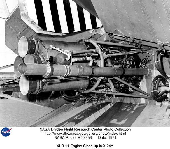 Keywords: XLR-11 Engine Close-up in X-24A DVIDS727760.jpg en This photo shows a close-up view of the XLR-11 rocket engine mounted in the X-24A lifting body research vehicle The X-24A would be air-launched from a B-52 mothership and then its pilot would light the XLR-11 rocket engine for the powered portion of the research flight The X-24A would then glide back to a landing on a lakebed near the NASA Flight Research Center Edwards California The X-24 was one of a group of lifting bodies flown by the NASA Flight Research Center now Dryden Flight Research Center Edwards California in a joint program with the U S Air Force at Edwards Air Force Base from 1963 to 1975 The lifting bodies were used to demonstrate the ability of pilots to maneuver and safely land wingless vehicles designed to fly back to Earth from space and be landed like an airplane at a predetermined site Lifting bodies' aerodynamic lift essential to flight in the atmosphere was obtained from their shape The addition of fins and control surfaces allowed the pilots to stabilize and control the vehicles and regulate their flight paths Built by Martin Aircraft Company Maryland for the U S Air Force the X-24A was a bulbous vehicle shaped like a teardrop with three vertical fins at the rear for directional control It weighed 6 270 pounds was 24 5 feet long and 11 5 feet wide measuring just the fuselage not the distance between the tips of the outboard fins Its first unpowered glide flight was on April 17 1969 with Air Force Maj Jerauld Gentry at the controls Gentry also piloted its first powered flight on March 19 1970 The X-24A was flown 28 times in the program that like the HL-10 validated the concept that a Space Shuttle vehicle could be landed unpowered The fastest speed achieved by the X-24A was 1 036 miles per hour mph--Mach 1 6 Its maximum altitude was 71 400 feet It was powered by an XLR-11 rocket engine with a maximum theoretical vacuum thrust of 8 480 pounds The X-24A was later modified into the X-24B The bulbous shape of the X-24A was converted into a flying flatiron shape with a rounded top flat bottom and double delta platform that ended in a pointed nose The X-24B demonstrated that accurate unpowered reentry vehicle landings were operationally feasible Top speed achieved by the X-24B was 1 164 mph and the highest altitude it reached was 74 130 feet The vehicle is on display at the Air Force Museum Wright-Patterson Air Force Base Ohio The pilot on the last powered flight of the X-24B was Bill Dana who also flew the last X-15 flight about seven years earlier The X-24A shape was later borrowed for the X-38 Crew Return Vehicle CRV technology demonstrator for the International Space Station NASA Identifier NIX-E-23356 2009-09-23 Glenn Research Center https //www dvidshub net/image/727760 727760 2012-10-17 14 16 WASHINGTON DC US PD-USGov Martin-Marietta X-24 Aircraft at Rogers Dry Lake Images from DoD uploaded by Fæ |