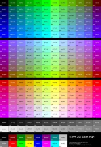 | Keywords: Xterm 256color chart.svg ;Other information This upload is a re-worked version of the existing chart on the Xterm page the existing chart has been placed in the public domain by its author bmdavll I am also placing my SVG version in the public domain from a list of colors matching the PNG on Wikipedia xterm page by bmdavll 2012-06-05 Jasonm23 Cc-zero Lowercase Lowercase title Original upload log en wikipedia Xterm_256color_chart svg wikitable - 2012-06-04 16 04 960×1400× 65589 bytes Jasonm23 Uploading a self-made file using File Upload Wizard Color charts |