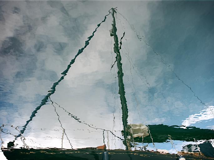 Keywords: yacht sailboat reflection water rigging ripples distort distortion pattern abstract yachting boat sea sail boat leisure sailing inversion mirage hallucination dream vision