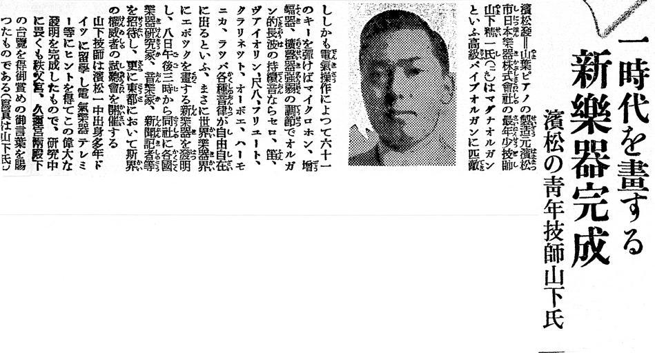 | Keywords: Yamaha Magna Organ article on Hochi Shimbun 1935-06-08 (clip).jpg ja <br/> ; 時代を畫する新樂器完成 ;濱 の 年 師山下氏 濱 發 山葉ピアノの製 元濱 市日 樂器株式 社の 年少 師山下精 氏(二 )はマグナオルガンという高級パイプオルガンに匹敵ししかも電氣操 によって六十 のキーを彈けばマイクロホン 增幅器 擴聲器強弱の調 でオルガン的長波の持續音ならセロ 笛 ヴァイオリン 尺八 フリュート クラリネット オー エ ハーモニカ ラッパ各種音律が自由自 に出るといふ まさに世界樂器界にエ ックを畫する新樂器を發明し 八日午後三時から同社に各 樂器研究家 音樂家 新聞記 等を招待し 更に 都において斯界の権威 の試聽 を開催する 山下 師は濱 中出身多年ドイツに留學し電氣樂器テレミー等にヒントを得てこの偉大な發明を完成したもので 研究中に畏くも秩父宮 久邇宮両殿下の台覧を得御賞めの御 葉を ったものである(寫 は山下氏) References Hochi Shimbun 1935-06-08 2014-05-25 14 36 18 originally published in 1935-06-08 Yamaha Magna Organ article on Hochi Shimbun 1935-06-08 tiff Yamaha Magna Organ article on Hochi Shimbun 1935-06-08 tiff Hochi Shimbun derived work clusternote clipped corrected horizontal vertical remove background noise and converted to JPG clusternote Yamaha Magna Organ article on Hochi Shimbun 1935-06-08 tiff cc-zero Uploaded with UploadWizard Yamaha Magna Organ 1935 |