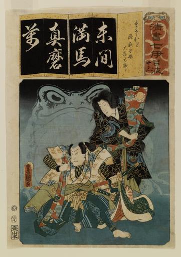 | Keywords: Yamamotoya Heikichi, Eikyudo - Seisho nana i-ro-ha - Walters 95130.jpg The actors Nakamura Fukusuke I and Iwai Kumesaburō III from left as Ota Tarō and Takiyasha-hime The wicked Princess Takiyasha is shown in this print invoking toad magic in her attempt to overcome her enemy the hero Mitsukuni According to legend Princess Takiyasha was the daughter of Taira no Masakado an evil magician and unsuccessful usurper of the throne who died in the year 940 After her father's death Takiyasha encountered Nikushisen the spirit of a toad whose witchcraft abetted her in fomenting a rebellion However the emperor's defender Mitsukuni courageously withstood the power of Takiyasha's magic thus quelling her ambitions 1856-08 late Edo pigments mulberry paper cm 35 5 25 2 accession number 95 130 40117 Justine Lewis Keidel date and mode of acquisition unknown Walters Art Museum Gift of Justine Lewis Keidel 1986 Signature Toyokuni ga place of origin Japan 006-0837 Walters Art Museum license 2D Japanese prints in the Walters Art Museum Media contributed by the Walters Art Museum needs category review Utagawa Kunisada |