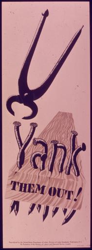 Keywords: "YANK THEM OUT" - NARA - 515368.jpg Scope and content General notes 515368 Local identifier 44-PA-1697 Office for Emergency Management Office of War Information Domestic Operations Branch Bureau of Special Services 03/09/1943 - 09/15/1945 Still Picture Records Section Special Media Archives Services Division NWCS-S National Archives at College Park 8601 Adelphi Road College Park MD 20740-6001 1941 - 1945 Record group Record Group 44 Records of the Office of Government Reports 1932 - 1947 Record group ARC 373 World War II Posters compiled 1942 - 1945 Series ARC 513498 File unit File unit ARC Variant control numbers NAIL Control Number NWDNS-44-PA-1697 Other versions <gallery> File YANK_THEM_OUT _-_NARA_-_515368 tif tif File YANK_THEM_OUT _-_NARA_-_515368 jpg jpg </gallery> NARA-cooperation PD-USGov World War II posters about tools from the United States Nails in art |