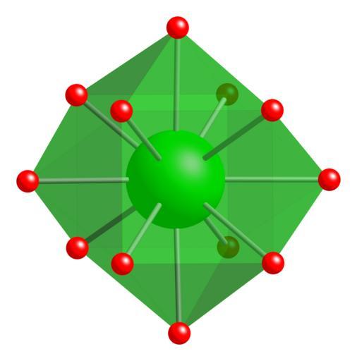 Keywords: YBCO-Ba-coordination-CM-3D-balls.png Ball-and-stick model of the cuboctahedral 12-coordination of barium in the crystal structure of the high-temperature superconductor yttrium barium copper oxide YBa<sub>2</sub>Cu<sub>3</sub>O<sub>7-<math>\delta</math></sub> X-ray crystallographic data from cite journal Acta Cryst C46 3 1990 354-358 10 1107/S0108270189006803 Untwinned single crystals of the high-temperature superconductor YBa<sub>2</sub>Cu<sub>3</sub>O<sub>7-<math>\delta</math></sub> K Brodt H Fuess E F Paulus W Assmus and J Kowalewski Model constructed and image generated in http //www crystalmaker com/ CrystalMaker 8 1 Own 2009-01-14 Ben Mills Benjah-bmm27 Images by Ben Mills Crystal structures of yttrium barium copper oxide Coordination compounds |