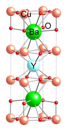 Keywords: YBCO-unit-cell-CM-3D-balls-labelled.png Ball-and-stick model of the unit cell of the high-temperature superconductor yttrium barium copper oxide YBa<sub>2</sub>Cu<sub>3</sub>O<sub>7-<math>\delta</math></sub> X-ray crystallographic data from cite journal Acta Cryst C46 3 1990 354-358 10 1107/S0108270189006803 Untwinned single crystals of the high-temperature superconductor YBa<sub>2</sub>Cu<sub>3</sub>O<sub>7-<math>\delta</math></sub> K Brodt H Fuess E F Paulus W Assmus and J Kowalewski Model constructed and image generated in http //www crystalmaker com/ CrystalMaker 8 1 Own 2009-01-14 Ben Mills Benjah-bmm27 Images by Ben Mills Crystal structures of yttrium barium copper oxide Unit cells |