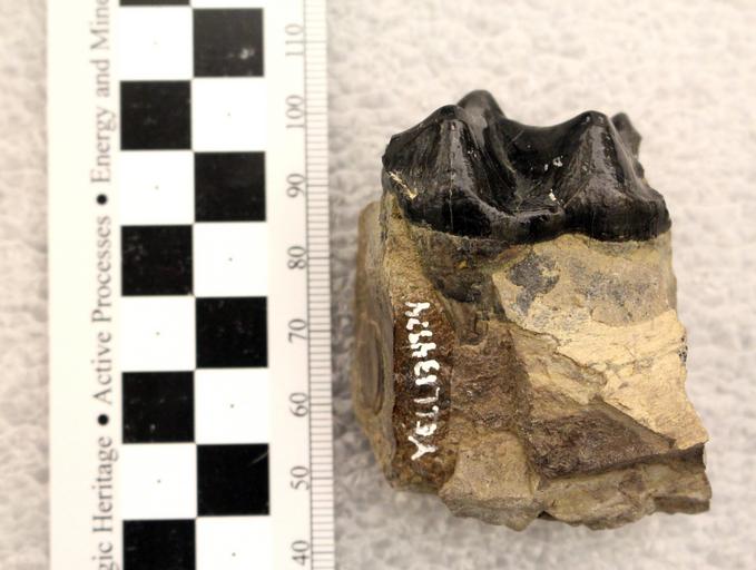 | Keywords: text YELL_134174 (1) and (2): Picture shows the second molar of a brontothere that was discovered in Yellowstone National Park in the late 1990s. The tooth is the black-colored part, while the jaw bone is the gray to white fragment.  Collecting any natural resources, including rocks and fossils, is illegal in Yellowstone. Photo by Megan Norr; March 2016; Catalog #20803d; Original #YELL_134174(1)   YELL_134174 (1) and (2): Picture shows the second molar of a brontothere that was discovered in Yellowstone National Park in the late 1990s. The tooth is the black-colored part, while the jaw bone is the gray to white fragment.  Collecting any natural resources, including rocks and fossils, is illegal in Yellowstone. Photo by Megan Norr; March 2016; Catalog #20803d; Original #YELL_134174(1) |