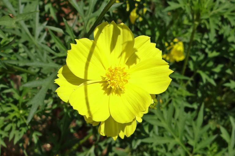 Keywords: yellow cosmos flowers golden blossoms blooming blooms spring gardens gardening flowering plants floral greens leaves leafy green background bright colorful fresh ornamental decorative