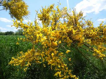 Keywords: yellow flowers spring bush yellow shrub sunshine nature easter pointed flower plant summer garden sky blue blue sky clouds