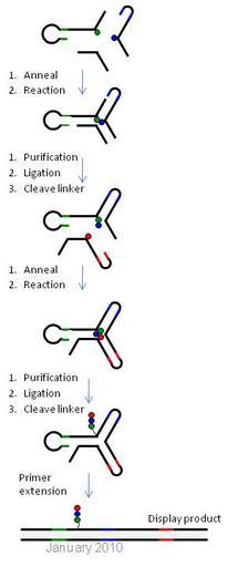 Keywords: Yoctoreactor library assembly wiki1.JPG en Figure 2 Stepwise assembly of a DEL library using YoctoReactor technology A 3-way reactor is shown here a Position 1 P1 and P2 BB are brought into close proximity and undergo a chemical reaction in the presence of a helper oligonucleotide in P3 b The structure is purified by polyacrylamide gel electrophoresis PAGE the P1 and P2 DNA is ligated and the P2 linker is cleaved c P3 BB is annealed to the P1-P2 ligation product from step b and a chemical reaction between P2 and P3 BBs takes place d The reaction product is purified by PAGE the DNA is ligated and P3 linker is cleaved yielding a compound OOO covalently attached to the folded yR e The yR is dismantled by primer extension yielding a double-stranded disply product exposing the reaction product for selection and molecular evolution own Viptrh 2010-05-21 Biochemistry |