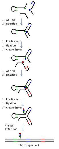 Keywords: Yoctoreactor library assembly wiki3.JPG en Figure 6 Stepwise assembly of a DEL library using YoctoReactor technology A 3-way reactor is shown here a Position 1 P1 and P2 BB are brought into close proximity and undergo a chemical reaction in the presence of a helper oligonucleotide in P3 b The structure is purified by polyacrylamide gel electrophoresis PAGE the P1 and P2 DNA is ligated and the P2 linker is cleaved c P3 BB is annealed to the P1-P2 ligation product from step b and a chemical reaction between P2 and P3 BBs takes place d The reaction product is purified by PAGE the DNA is ligated and P3 linker is cleaved yielding a compound OOO covalently attached to the folded yR e The yR is dismantled by primer extension yielding a double-stranded disply product exposing the reaction product for selection and molecular evolution own Viptrh 2010-05-21 Biochemistry |