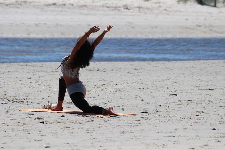 Keywords: yoga woman beach relaxation sand sporty beautiful