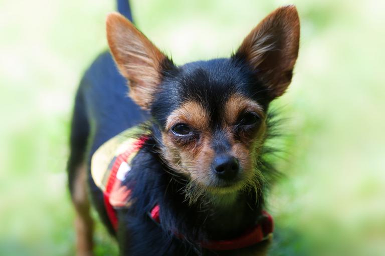Keywords: yorkshire terrier hybrid chihuahua cute black brown ear face view grass meadow animal animal portrait dog animal world pet fur head curious portrait mammal leash saddle